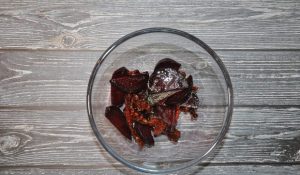 - Fertige gekühlte Rüben verteilen, schälen, halbieren, dann in kleine scheiben schneiden. In einer Salatschüssel zu kombinieren Rüben, getrocknete Tomaten, Öl, mischen.