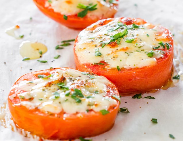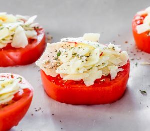 Große Tomaten in Kreise schneiden (6 Stk.), Darauf verteilen Backblech mit Backpapier, mit Salz bestreuen, darauf legen gehackter Parmesan mit Gewürzen und 7-10 Minuten in den Ofen geben, bis der Käse schmilzt.