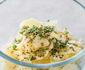 Parmesan grob einreiben oder in dünne Scheiben schneiden, in eine Schüssel geben, Oregano, gemahlenen Pfeffer dazugeben und mischen. Wir stellen den Ofen auf 200 Grad.