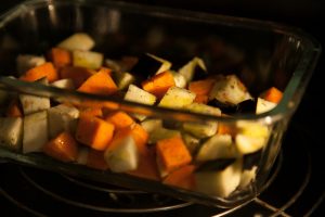 - Gemüse würfeln, Gewürze, Salz und Pfeffer hinzufügen. Mit Öl einsprühen.