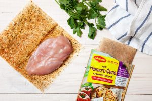 - Wir schlagen die Hähnchenbrust auf eine Dicke von ca. 1,5-2 cm. Wir falten ein Blatt zum Braten auseinander und legen die Brust darauf.