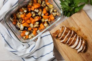 Köstlicher Salat mit Hähnchenbrust und gebackenem Gemüse, hausgemachte ist eine ideale Option Mittag- oder Abendessen für alle, die auf richtige Ernährung achten und will abnehmen. So einen Diätsalat kann man sogar machen Neuling! Es kann auch auf dem festlichen Tisch serviert werden.