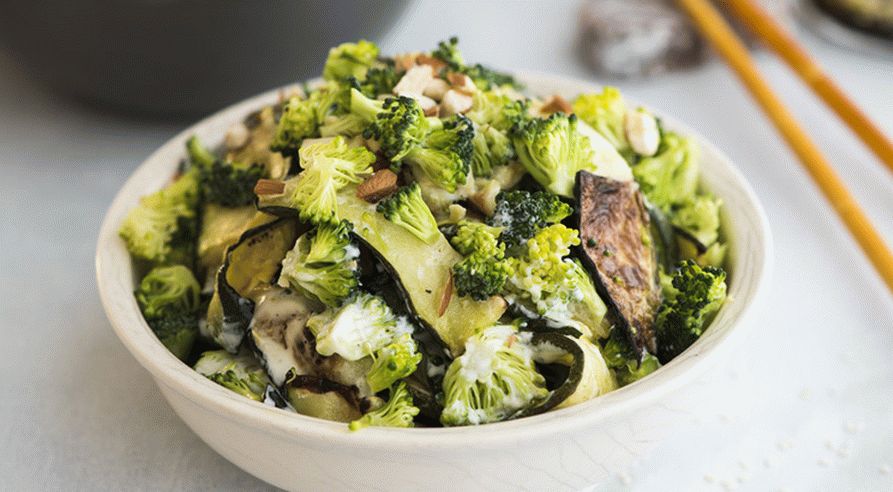 - Zucchini mit krümeligen Brokkoliblüten vermischen, dazugeben 40 g geröstete und gehackte Mandeln und servieren.