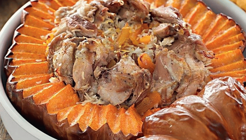 - Servieren Sie das Huhn in einem Kürbis auf dem Tisch und entfernen Sie das abgeschnittene Oberteil.