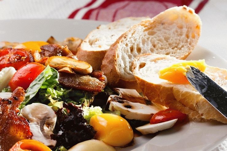 - Kopfsalatblätter verbreitet auf einer Platte. Mit Oliven bestreuen Öl und Balsamico-Essig. Speck, Tomaten verteilen, Champignons und Eigelb auf einem Salat.