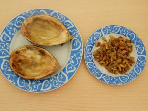- Wir bedecken das Backblech mit speziellem Kochpapier. Die Boote gefüllt mit Füllung und mit geriebenem Käse und Crackern bestreuen. Einbacken schon vorgeheizten Backofen für ca. 15 Minuten. Wir stellen die Temperatur auf 200 ein grad.
