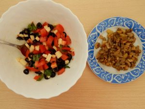 - Gemüse und Käse schneiden, mischen und mit Pfeffer, Salz und Pfeffer würzen das restliche Olivenöl.