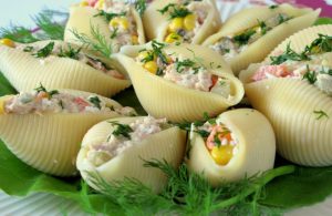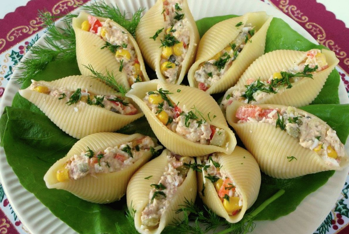 Ein origineller und leckerer Snack aus großen Nudelschalen kann sein zu Hause kochen. Wir füllen die Muscheln mit Thunfischkonserven, Hartkäse, Paprika, gekochte Eier, Gurken und Mais. Eine solche Vorspeise zuzubereiten ist nicht schwierig.