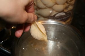 Große Muscheln werden in kochendes Salzwasser gegeben und gekocht gemäß den Anweisungen auf der Verpackung. Auf einem großen, geschlitzten Löffel verteilen Platte, um nicht aneinander zu kleben und zu kühlen. Eier kochen hart gekocht und sauber.