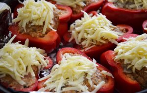 Den Käse grob einreiben, mit gefüllten Paprikaschoten bestreuen und abschmecken 30 Minuten in den Ofen stellen.