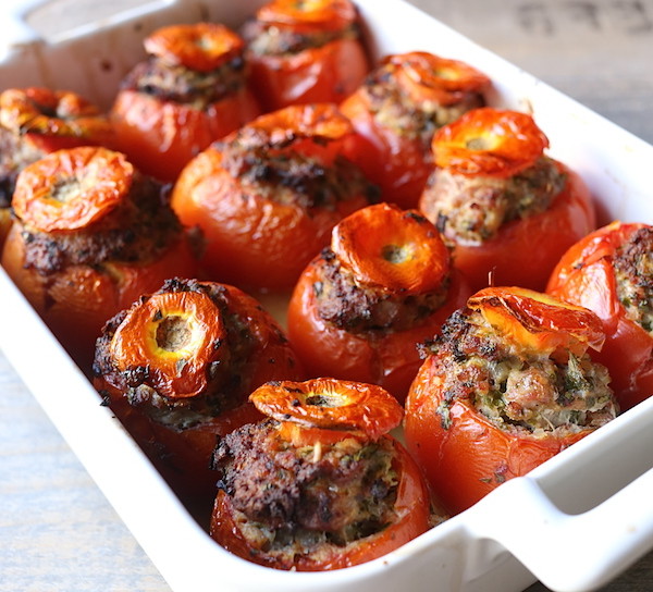 Wir würzen die zubereiteten Tomaten mit aromatischem Hackfleisch, abdecken, in eine Form geben und bei 50 ° C in den Ofen stellen Minuten.