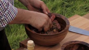 In einer Schüssel, in der das Fleisch eingelegt wird, umrühren Olivenöl mit Zitronensaft, Worcester-Sauce, gehackt Knoblauch, roter Pfeffer und gehackter Koriander.