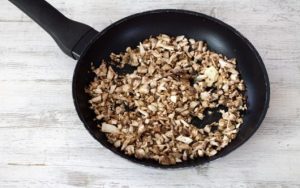 Zwiebel mit Champignons fein hacken, Knoblauch hacken durch die Presse. Die Zwiebel in Öl anbraten und hinzufügen vorbereitete Champignons, Knoblauch, bis die Flüssigkeit verdunstet. Abkühlung.