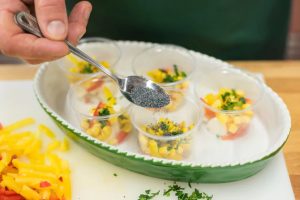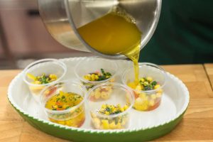 Gehacktes Gemüse für Aspik in einen kleinen Topf geben Käse, und fügen Sie auch Mais. Gießen Sie die Zutaten ein wenig die Menge an Mohn.