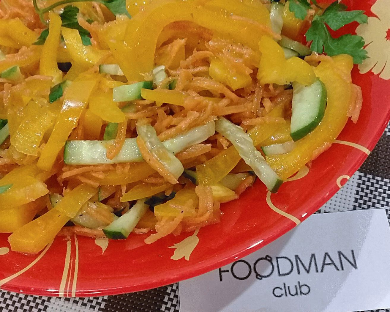 Ich liebe Experimente und dieser Salat ist einer von ihnen. Natürlich vielleicht ich nicht die einzige Person auf der Erde, die so einen Salat gemacht hat, aber nichtsdestotrotz – was in meinem Salat lag, hat mich in diesen Salat getrieben der Kühlschrank. Wie mein Mann sagt, muss man aus dem kochen, was ist zur Hand und ich hatte eine Gurke, Paprika und koreanische Karotten. Opla, und es stellte sich heraus, dass es so unglaublich lecker war, dass es sofort war in der Liste meiner Lieblingsgerichte enthalten. Und sogar getestet worden in Später Gäste auf der Geburtstagsfeier, was positive Emotionen hervorruft. Aber denken Sie daran, der Geschmack der koreanischen Karotten ist von großer Bedeutung.