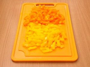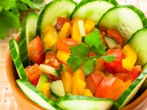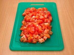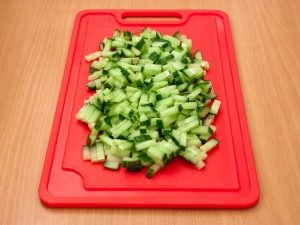 - Lassen Sie uns das Gemüse vorbereiten: waschen, Gurken in Streifen schneiden (Teil zum Dekorieren lassen), Tomaten – gewürfelt, geschält, geschält Samen, Trennwände – Strohhalme.
