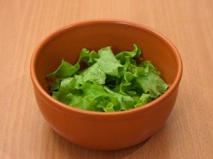 - In einer Salatschüssel Salatblätter von Hand zerreißen.