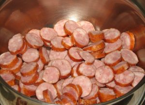 Schneiden Sie die Würste in Kreise und werfen Sie sie in die Pfanne.