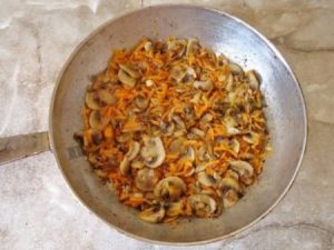 - Champignons in Scheiben schneiden, Zwiebel in Würfel schneiden, Möhren anreiben Reibe. Champignons mit Gemüse unter Zugabe von Öl anbraten.