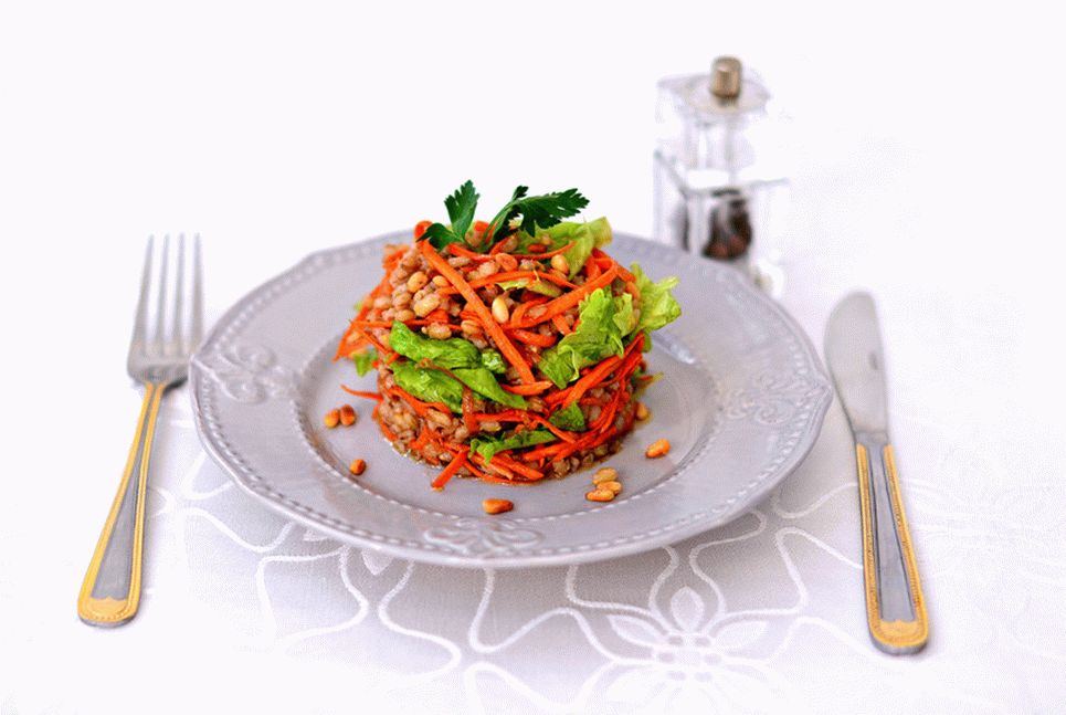- Mischen Sie die Gerste, Karotten, Salat und Pinienkernen, Wir füllen alles mit dem resultierenden Dressing und mischen.