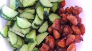 - Mischen Sie 2 Esslöffel Sojasauce, 2 Esslöffel Öl und Pfeffer mischen alles. Mischen Sie in der Salatschüssel das Huhn, Gurken und Dressing.