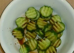 - Schneiden Sie die Gurke in Kreise. In eine Schüssel geben und hinzufügen Salz, Essig. Mischen.