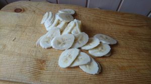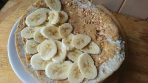 - Auf einem Teller verteilen, mit Erdnussbutter einfetten und Bananenscheiben auf einen halben Pfannkuchen legen. Bedecke die Sekunde halb und servieren!