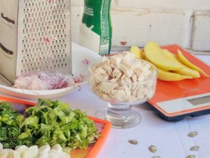 - Den fertigen Salat vorsichtig auf einem Teller darüber verteilen den Rettich ausbreiten. Aus der Mango schneiden wir vorsichtig den Hühnerkopf. Augen und wir machen einen Schnabel mit Hilfe von Kürbiskernen, Beine aus den Stielen der Petersilie. Die restlichen drei Mangoscheiben sind flügelförmig ausgelegt.