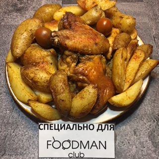 Duftendes Hähnchen im Saft gebacken und knusprig Kartoffeln auf rustikale Weise.