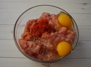 - Fügen Sie das Hackfleisch hinzu und fügen Sie die gehackten Zwiebeln, Gewürze und Eier hinzu.