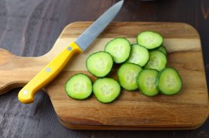 Gurke in Kreise schneiden, in einer Schüssel mit Sauce verteilen, mischen und 15 Minuten einwirken lassen.