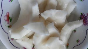 - Wir reinigen das weiße Fruchtfleisch der Kokosnuss von der braunen Schale. Dann melken und die chips sind weiß.