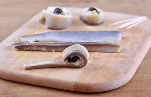 Wir legen die Pflaumen auf den Hering und machen daraus Brötchen. Wenn Der Hering wird aufgedeckt und mit Zahnstochern befestigt.