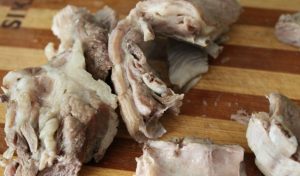 - Wir nehmen das Fleisch aus der Brühe, trennen die Knochen, schneiden und kehre mit gehackten Kartoffeln zurück.
