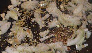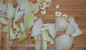 - Olivenöl in eine schwere Pfanne geben, erhitzen, braten Zwiebeln mit Knoblauch.