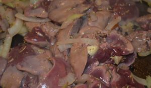 - Die Leber in eine Pfanne geben, salzen, pfeffern, braten, Rühren für zwei Minuten.