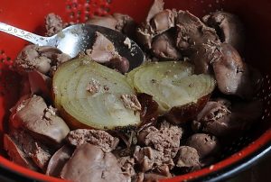 Wir werfen die fertige Leber in ein Sieb (wir verlassen die Brühe) und cool