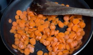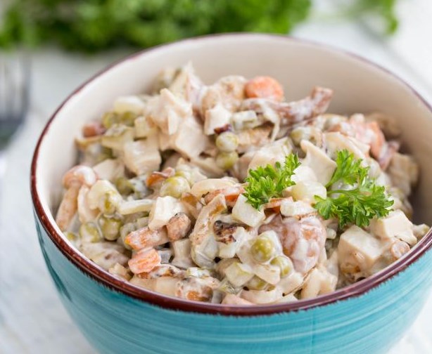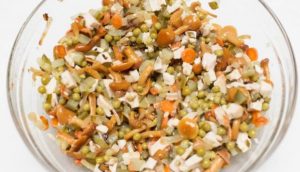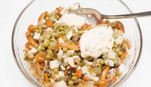 Die Karotten in Kreise schneiden, Zwiebeln in halbe Ringe schneiden und anbraten separat einölen, bis es weich ist. Erbsen abtropfen lassen, Gurken in Würfel schneiden, eingelegte Champignons in ein Sieb legen und spülen.