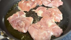 An den Hühnerschenkeln den Knochen abschneiden, mit Salz bestreuen, an senden Öl, bei mittlerer Hitze braten und abkühlen lassen.
