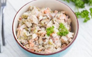 Köstlicher Salat aus gebratenem Huhn, eingelegten Pilzen, Karotten, kochen sie zwiebeln, erbsen und gurken in dosen zu hause für den Feiertagstisch.