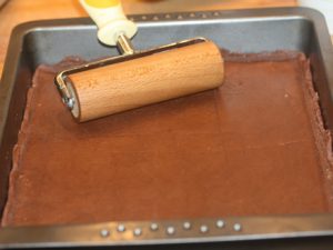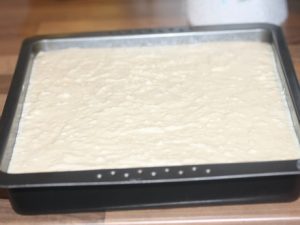 - Wir geben einen Teil des Teigs in die Auflaufform und rollen ihn aus ihn.