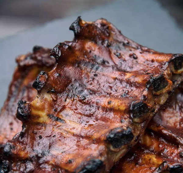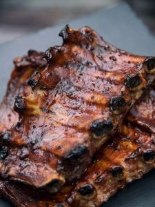 Nach 3 Stunden die Rippen öffnen, großzügig mit BBQ-Sauce einfetten, Erhöhen Sie die Temperatur auf 240 Grad und backen Sie für weitere 5-6 Minuten, bis gebräunt.