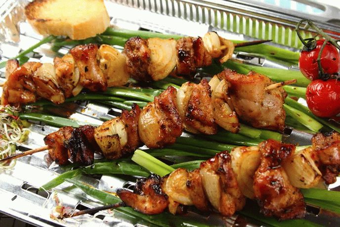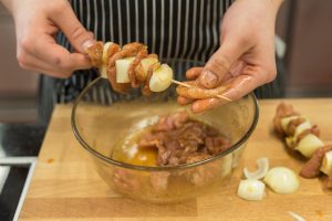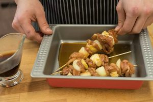 - Nach der vorgesehenen Zeit zum Einlegen von Hühnchen und Zwiebeln auf Holzspießen.