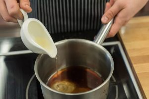 Fahren Sie nun mit der Zubereitung einer weiteren Marinade fort. In die Pfanne muss Sojasauce, Reisessig, Reiswein mischen, Sake und Zucker. Die Mischung zum Kochen bringen und kochen lassen 2-3 Minuten.