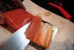 - Form mit Frischhaltefolie auskleiden. Eine Teigschicht auf den Boden legen. Dann eine Schicht Käsemasse und eine Schicht Fisch. Sammle die Ebenen in dieser Reihenfolge Lasagne. Deckschicht aus Teig.