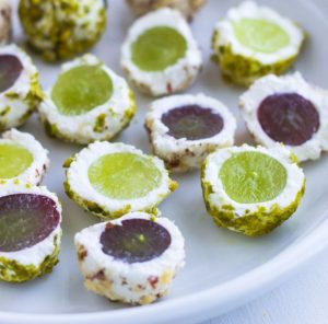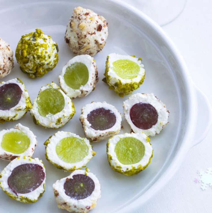 Wir nehmen weichen Ziegenkäse in kleine Stücke und wickeln ihn ein vorbereitete Trauben, gehacktes Brötchen dazugeben Pistazien in Haselnüsse schneiden und auf einen flachen Teller geben.