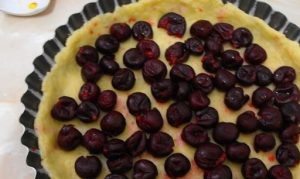 - Wir verteilen den Teig in einer Auflaufform. Die Beeren verteilen gießen Sie die cremige Masse.
