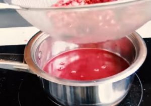 - Erhitzen, bis sich der Zucker vollständig aufgelöst hat, vom Herd nehmen und Kirschsaft hinzufügen. Sie können ein Sieb oder eine Saftpresse verwenden.