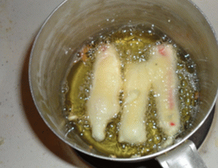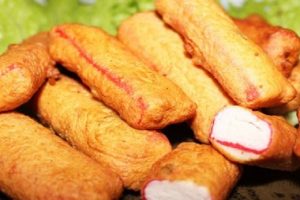 - Nehmen Sie aufgetaute und geschälte Krabbenstäbchen, tauchen Sie sie in eine Schüssel und dämpfen Sie sie nach dem Braten in kochendem Sonnenblumenöl