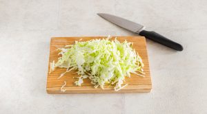 - Den Kohl mit einem Messer dünn hacken, das entstehende Stroh halbieren. Salz hinzufügen, mischen und in Ruhe lassen.